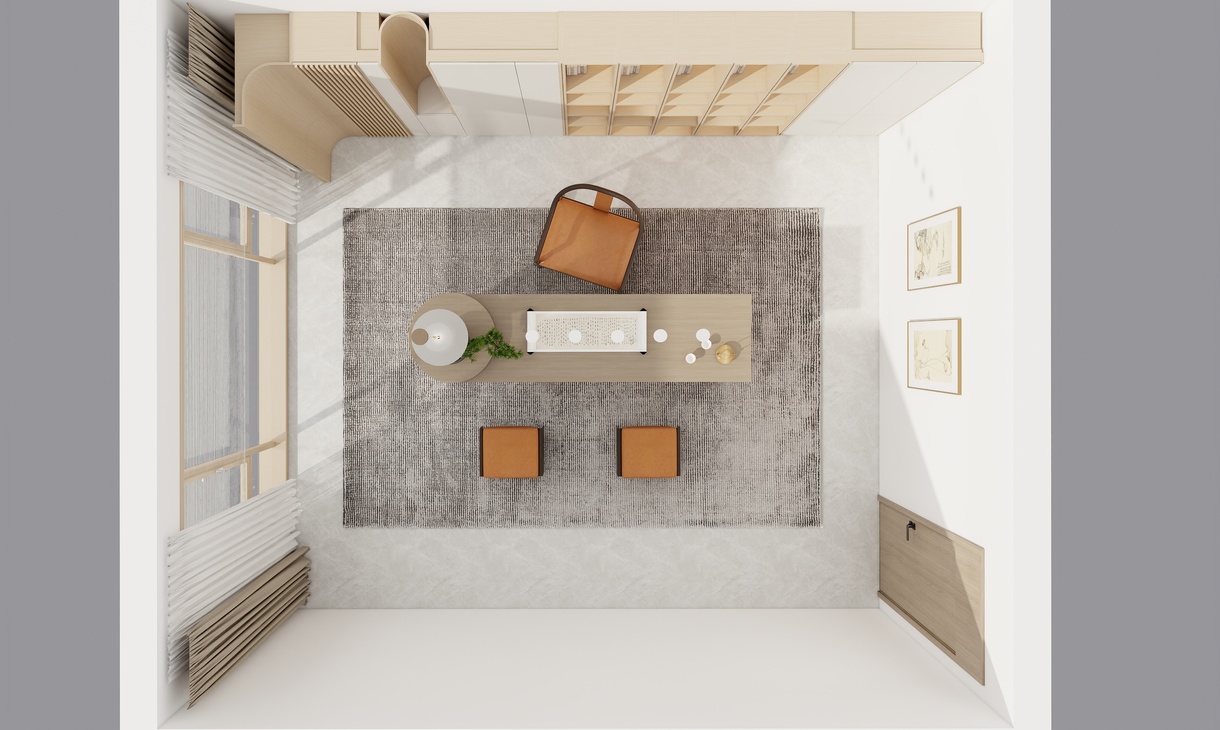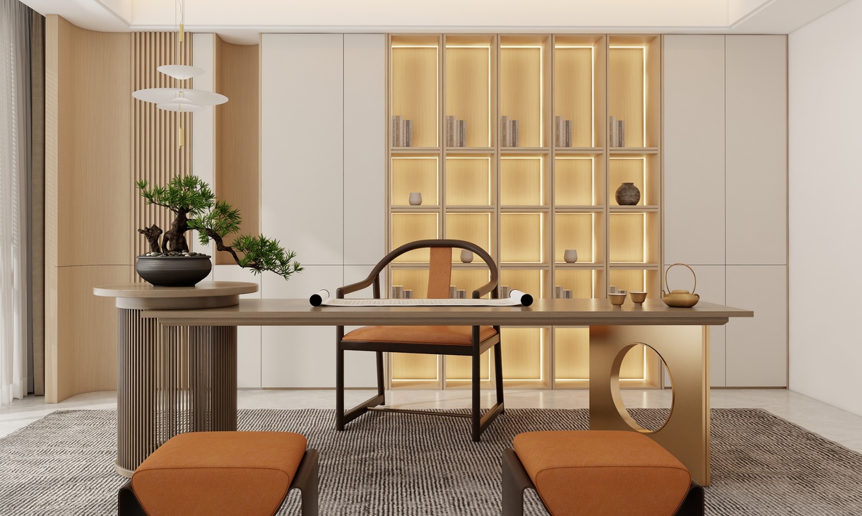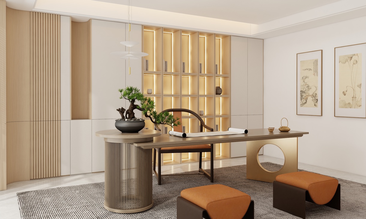 此茶室書房空間,以現代骨相承載宋式氣韻,摒棄堆砌,專注素簡與精致。 細節處見真章: 圓弧柔化棱角, 格柵篩落光影, 夾心層板/立板增加空間層次, 止口板實現無縫收口。 每一處工藝的精研打磨,共同營造出含蓄內斂、溫潤雅致的空間氣質,邀您靜享品茗、讀書之趣。